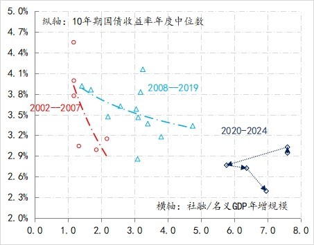 2002年至2007年期间,该比值稳定在1—2之间,均值1.5。2007年至2019年期间,该比值扩大至1.5—4.8,均值为3,较2002年至2007年间水平翻了一倍,而当前7的比值则是又翻了一倍多,显示经济增长需要消耗的新增融资越来越多。