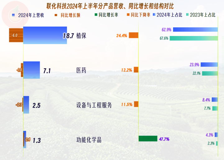 四大单列的业务中,只有“功能化学品”业务有不错的增长,其他三大系列业务都在下跌,核心的“植保”业务下跌严重,占比也从原来的近七成,降至六成出头。