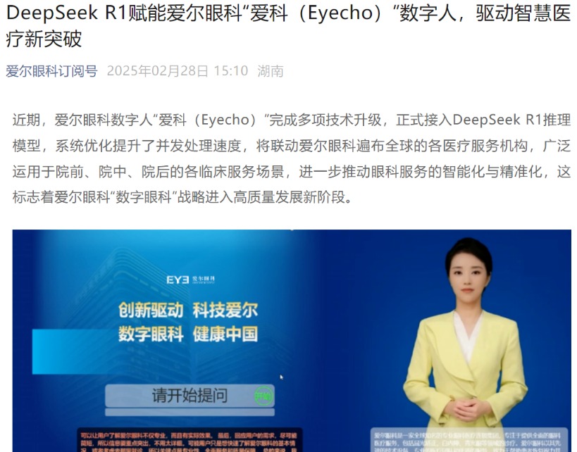 每经AI快讯,近期,爱尔眼科数字人“爱科(Eyecho)”完成多项技术升级,正式接入DeepSeek R1推理模型,系统优化提升了并发处理速度,将联动爱尔眼科遍布全球的各医疗服务机构炒股10倍杠杆,广泛运用于院前、院中、院后的各临床服务场景,进一步推动眼科服务的智能化与精准化,这标志着爱尔眼科“数字眼科”战略进入高质量发展新阶段。