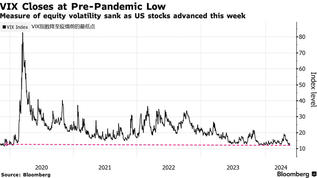 在股市创新高的同时,一项衡量期权价值的关键指标显示,交易员对股市的担忧情绪已经降至疫情前的最低水平。衡量标准普尔500指数30天隐含波动率的芝加哥期权交易所波动率指数(Cboe Volatility Index)上周五收于2019年11月以来的最低水平,基准股指在略低于历史高点的窄幅区间内交易。除了4月份的一次飙升外,随着股市攀升,波动率指数在2024年的大部分时间里一直保持低位。