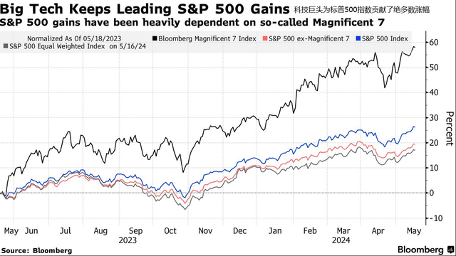 另一主要推动来自于对人工智能技术的狂热,但是英伟达公司一家巨头就为标准普尔500指数贡献了约四分之一的涨幅。加上微软、亚马逊、Meta Platforms Inc.和谷歌母公司Alphabet,标准普尔500指数约53%的涨幅来自这五只股票。