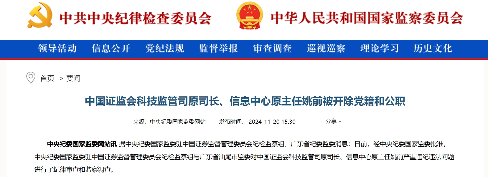 11月20日,中央纪委国家监委网站通报,中国证监会科技监管司原司长、信息中心原主任姚前被开除党籍和公职。